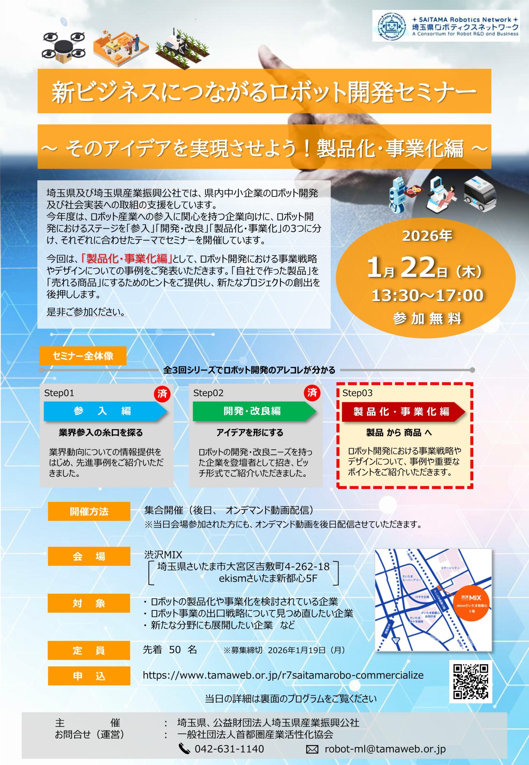 | 名 称: | 新ビジネスにつながるロボット開発セミナー ~そのアイデアを実現させよう!製品化・事業化編~ |