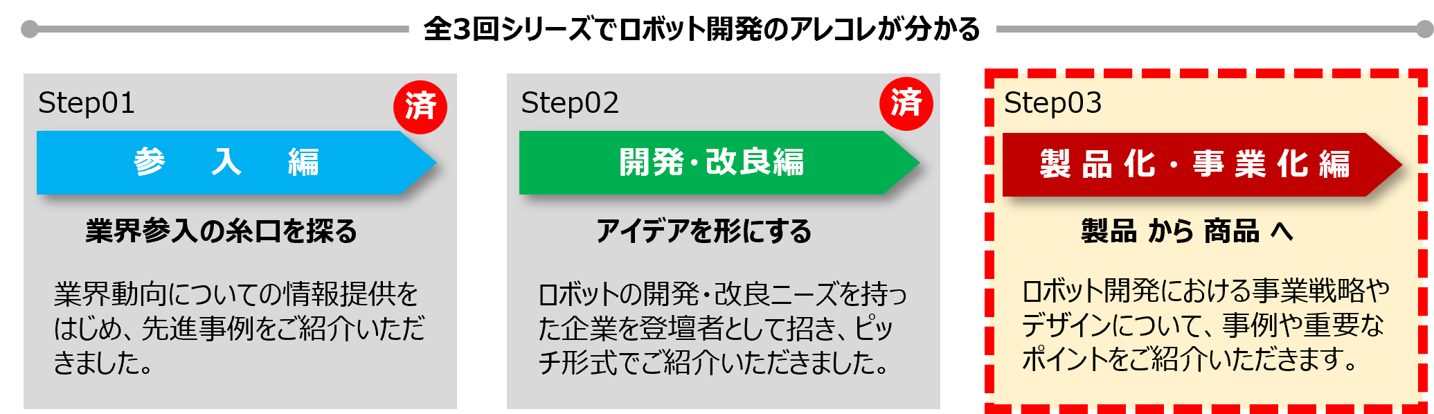 今年度は、ロボット産業への参入に関心を持つ企業向けに、ロボット開発におけるステージを「参入」「開発・改良」「製品化・事業化」の3つに分け、それぞれに合わせたテーマでセミナーを開催しています。